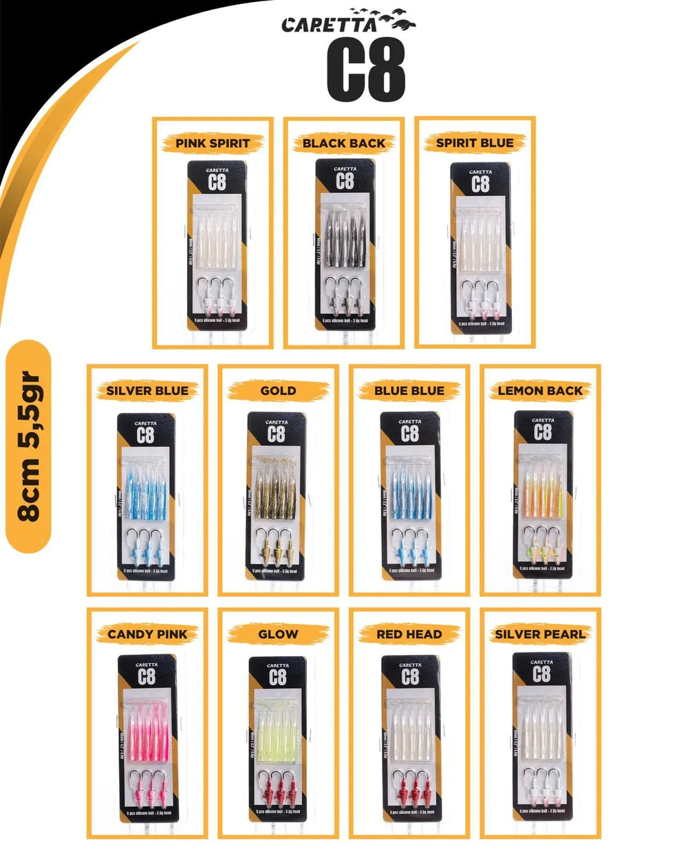 Caretta C8 Silikon Yem Seti ile avcılığın tadını çıkarın! Bu set, 5 adet silikon yem ve 3 adet jig head içermektedir. Yumuşak gövde yapısı ve esnek kuyruğu, yemlere doğal bir hareket kazandırarak su altında gerçek bir balık hissi uyandırır. Yüksek kaliteli boyası ve dikkat çekici renk seçenekleri sayesinde tüm avcı balıkların ilgisini çeker. Özellikle levrek, lüfer, turna ve sudak gibi avcı balıklar için mükemmel bir tercih olan Caretta C8, zor koşullarda bile etkileyici performans sergiler.