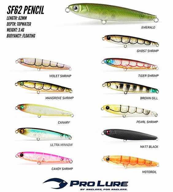 Pro Lure SF62 Pencil, yüzer (floating) özelliğine sahip bir su üstü sahtesidir. Tam bir "Finesse” hafif takım sahtesi olan SF62 ince yavru yemlik balıkların su üstünde sunumunu sağlayabilmeniz için tasarlanmıştır.