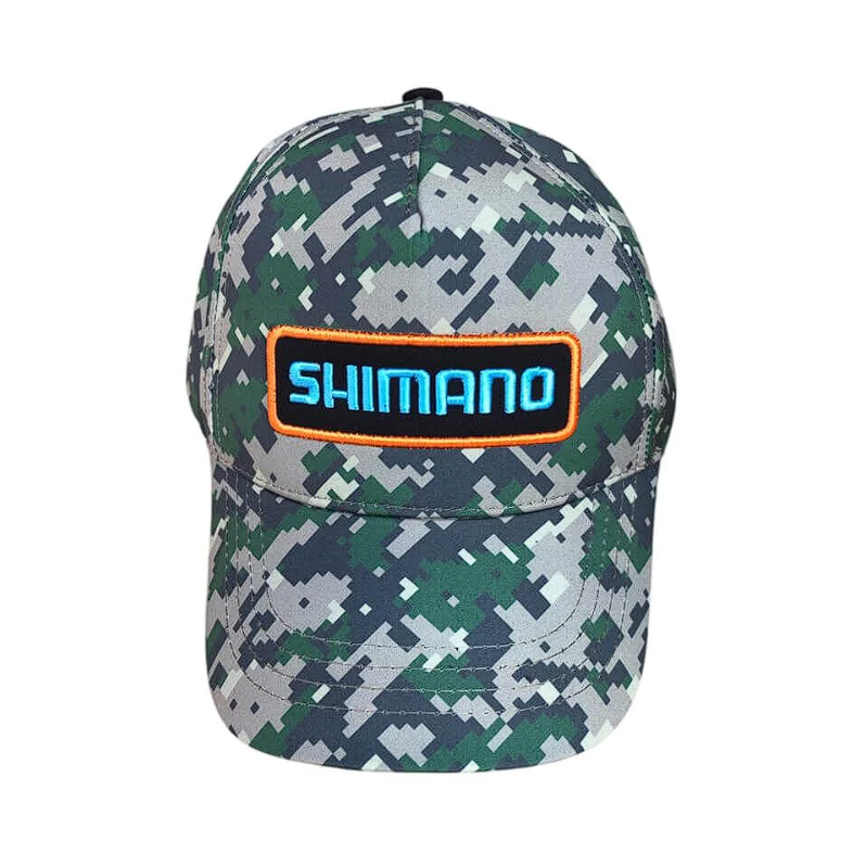 Teknede, kıyıda ve günlük kullanımda hem fonksiyonel hem iddialı bir görünüm. Shimano kep, yeşil–gri dijital kamuflaj deseni ve öndeki turuncu çerçeveli, mavi nakış SHIMANO patch ile dikkat çeker. Hafif, hızlı kuruyan kumaşı ve kavisli siper yapısı güneşli günlerde konfor sağlar.
